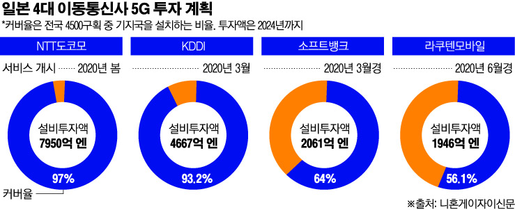 NTT도코모와 KDDI가 각각 5년간 약 1조 엔을 투입하며 소프트뱅크는 5000억 엔을 투자할 전망이다. 오는 10월 이통 사업에 신규 진출하는 라쿠텐모바일은 2000억~3000억 엔의 투자가 예상된다.