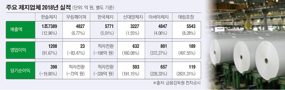 11일 금융감독원 전자공시에 따르면 업계 1위 한솔제지는 지난해 매출 1조7389억 원, 영업이익 1208억 원을 거두며 2017년 대비 각각 12.96%, 91.67% 개선됐다. 같은 기간 당기순이익은 390억 원으로 전년 대비 19.80% 줄어들었다. 한솔제지 측은 전반적으로 시장 상황이 좋아 매출과 영업이익 모두 늘었으나 원·달러환율 상승과 인쇄용지 부문의 실적 하락으로 당기순이익은 크게 증가하지는 않았다고 설명이다. 한솔제지는 고급포장용 산업용지와 인쇄용지를 주력 사업으로 하고 있다.
