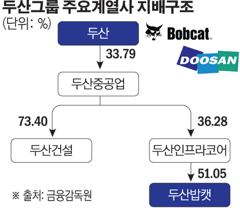 그동안 두산중공업이 사실상의 지주사 역할을 했지만, 탈원전 정책에 직격탄을 맞으며 실적이 악화되자 지금은 두산인프라코어가 자금 공급 측면에서 역할을 대신하고 있다.