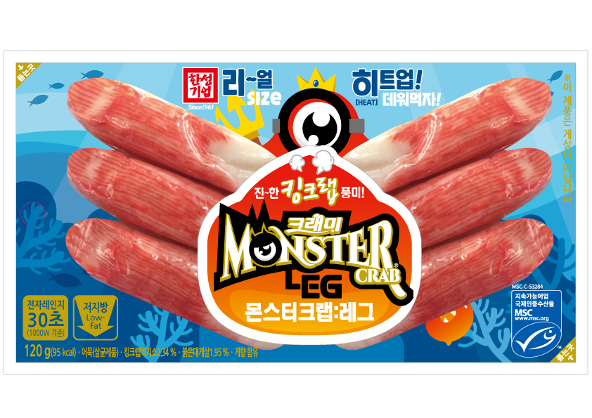 몬스터크랩은 작년 4월부터 한성기업에서 출시한 빅사이즈 고급 맛살 브랜드다. 게의 부위별 모양과 식감을 살려낸 것이 특징이다.