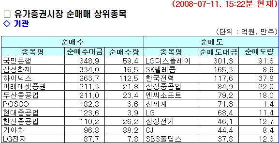 종목별로 기관들은 유가증권시장에서 국민은행 348억원, 삼성화재 334억원, 하이닉스 263억원, 미래에셋증권 211억원 순으로 순매수세를 보였으며 LG디스플레이 301억원, SK텔레콤 165억원, 한국전력 117억원, 삼성중공업 84억원 순으로 순매도세를 보였다.