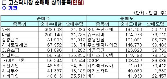 코스닥시장에서는 NHN 36억원, 다음 20억원, 성광벤드 8억원, 하나로텔레콤 6억원 순으로 순매수했으며 소디프신소재 19억원, 슈프리마 17억원, 쌍용건설 17억원, 주성엔지니어링 14억원 순으로 순매도했다.