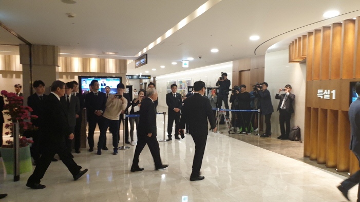 손경식 한국경영인총연합회 회장이 12일 오전 서울 서대문구 신촌세브란스 병원 장례식장에 마련된 고 조양호 한진그룹 회장의 빈소로 들어가고 있다.