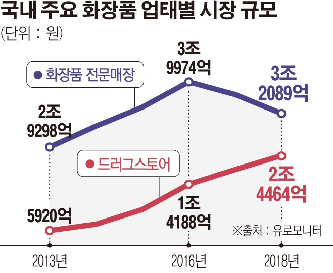 유로모니터 분석에 따르면 브랜드숍을 비롯한 화장품 전문매장 시장 규모가 지난해 기준 3조 2089억 원이었으며 올리브영, 랄라블라 등 드럭스토어(H&B스토어) 시장은 2조4464억 원 규모다. 아직까지 전문매장 시장이 드럭스토어보다 크지만 2016년을 기점으로 관련 시장은 매년 시장규모가 축소되고 있다. 지난해는 2014년 수준으로 축소됐다. 반면 드럭스토어 시장은 2013년 이후 연평균 32.8% 성장하며 2013년 대비 지난해 시장규모는 313%나 커졌다.