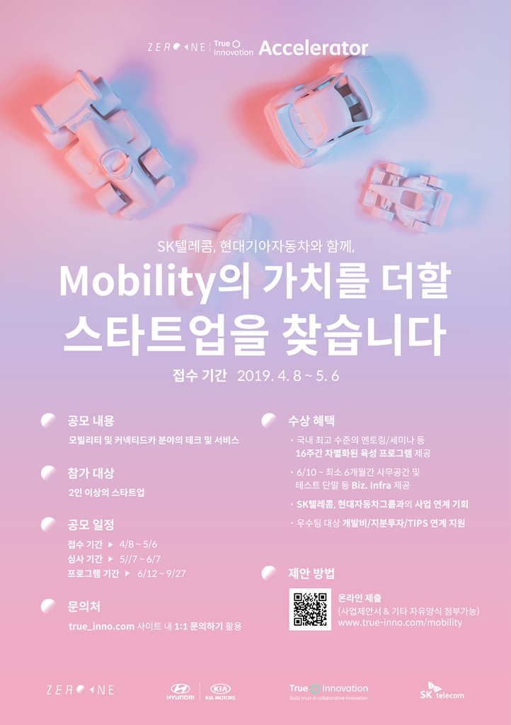SK텔레콤은 현대기아차와 모빌리티 및 커넥티드카 분야의 테크∙서비스 스타트업을 선발해 육성∙투자하는 제로원 트루이노베이션 엑셀러레이터 프로그램을 시행한다고 16일 밝혔다.