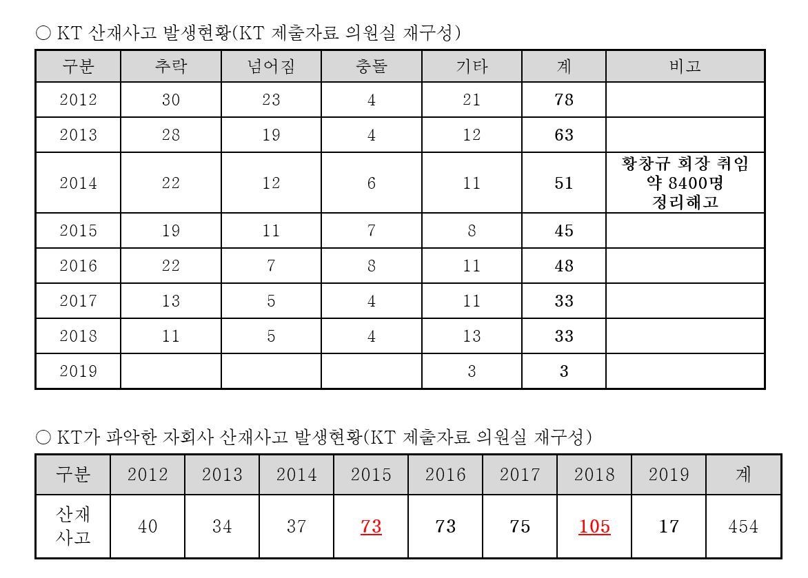 과학기술정보방송통신위원회 김종훈 국회의원(민중당, 울산동구)이 KT로부터 제출받은 자료에 따르면 2013년과 2014년 각각 34명, 37명이었던 자회사 산재사고는 황창규 회장 취임 다음 해인 2015년 73명으로 2배 증가했다. 특히 아현화재가 발생한 지난해의 경우에는 105명으로 3배 가까이 늘었다.