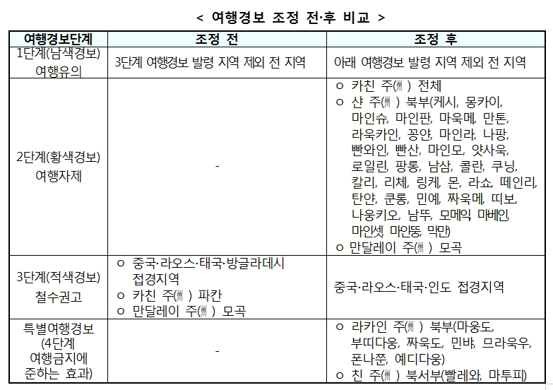 또한 카친 주 전체와 샨 주 북부 일부 지역 등에는 신변 안전에 특별히 유의해야 하는 2단계(황색) 여행경보가 각각 발령됐다. 나머지 지역도 신변 안전에 유의해야 하는 1단계(남색) 여행경보 지역으로 지정됐다.