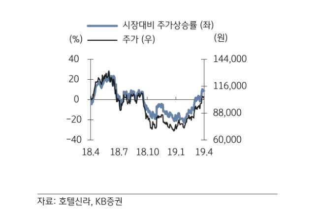 KB증권은 18일 호텔신라에 대해 면세 시장 성장에 따른 실적 호조가 예상된다며 목표주가를 기존 대비 19% 상향한 11만4000원으로 제시했다. 투자의견은 '매수'를 유지했다.