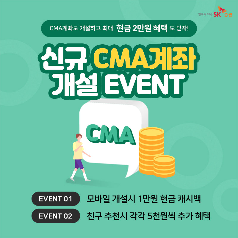 SK증권은 모바일에서 신규 종합자산관리계좌(CMA)를 개설하고, 친구에게 추천하면 최대 2만 원을 지급하는 이벤트를 시행한다고 18일 밝혔다.