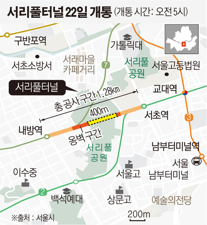 한편 서울시는 정식 개통을 하루 앞둔 21일 오후 3시 서초구 내방역측 터널 입구에서 ‘서리풀터널 개통식’을 연다. 박원순 서울시장과 조은희 서초구청장, 이창우 동작구청장, 서초구ㆍ동작구 지역주민 500여 명이 함께한다.
