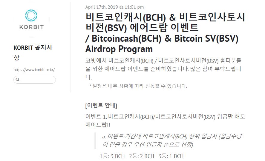 한편 코빗은 비트코인캐시와 비트코인사토시비전(BSV)의 입금 수량에 따른 에어드롭 이벤트를 진행한다.