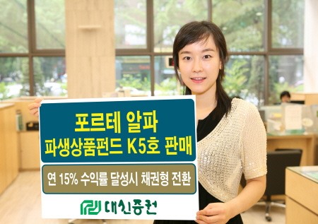 대신증권은 15일 손실을 최소화하면서 일정 목표수익률 달성 시 채권형으로 전환하여 안정적으로 운용하는 '대신 포르테 알파 파생상품펀드 K5호'를 16일부터 25일까지 판매한다고 밝혔다.