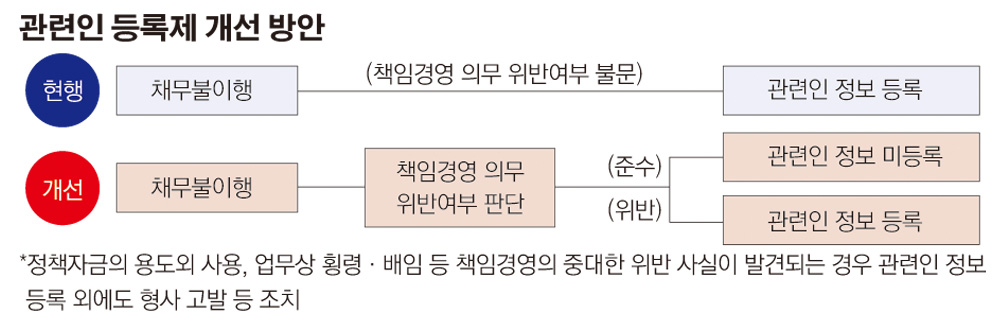 정부는 앞으로 '관련인 등록제'까지 완화할 계획이다. 현재 연대보증 없이 보증을 받은 경영인은 빚을 못 갚을 경우 신용정보원에 '관련인'으로 등록된다. 이 정보는 금융회사와 신용조회(CB)사에 공유되고, 개인신용평가 등에 활용된다. 금융거래상 불이익을 받을 가능성이 높다는 얘기다.
