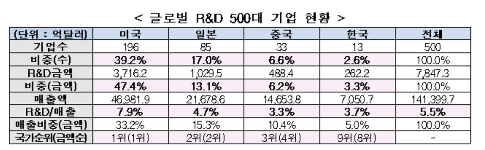 글로벌 R&D 500대 기업 소속 국가들이 투자하는 산업은 평균 16개였는데 한국 10개에 불과했다. 이는 미국 43개, 일본 33개, 중국 18개 등에 미치지 못하는 수준이다.