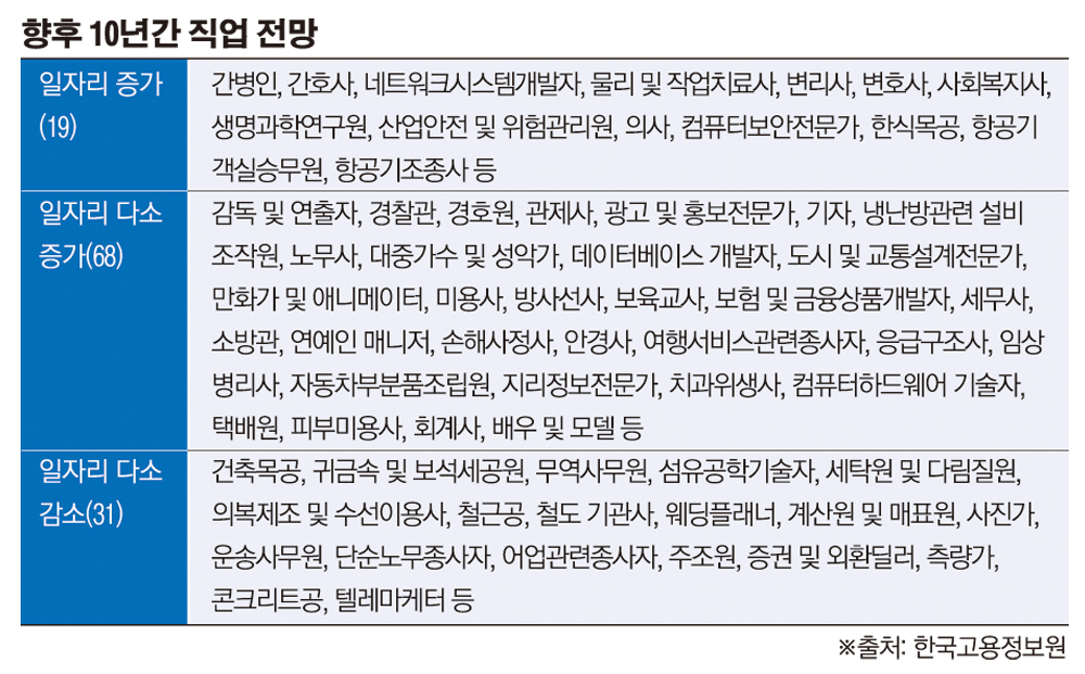 한국고용정보원은 25일 2018년부터 2027년까지 10년 동안 국내 대표 직업 196개의 고용 전망을 담은 ‘2019 한국 직업 전망’을 발간했다.