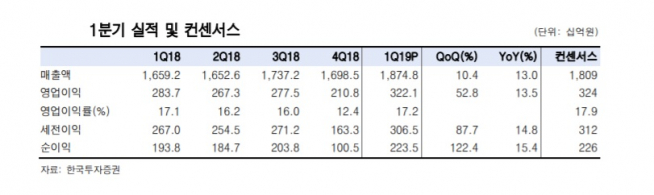나은채 연구원은 "동사의 1분기 매출과 영업이익은 전년대비 각각 13%, 14% 증가한 1조9000억 원, 3220억 원을 기록해 컨센서스에 부합했다"며 "특히 화장품 부문 매출이 전년대비 20% 증가한 1조14000억 원, 영업이익은 16% 증가한 2460억 원을 기록했다"고 밝혔다.