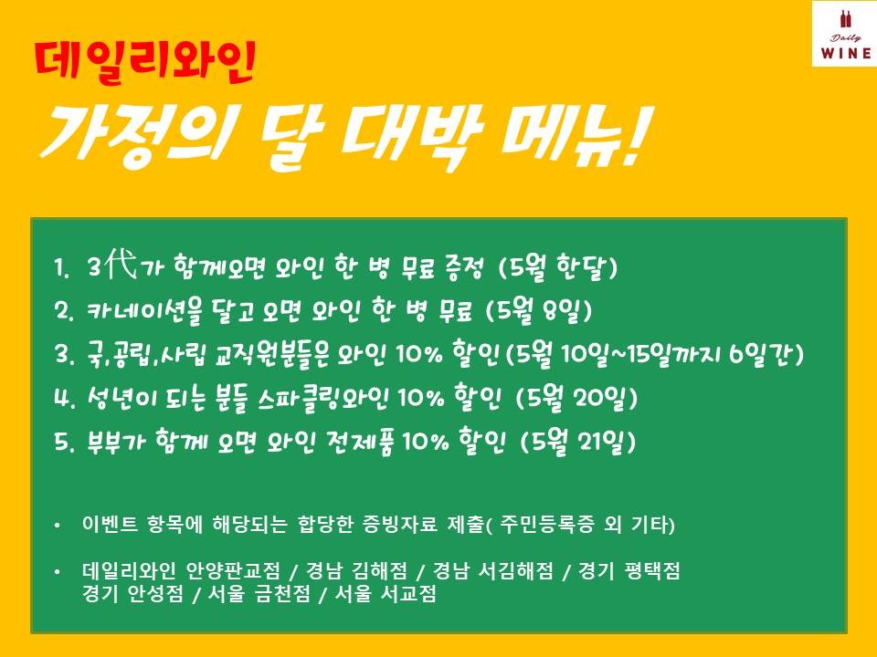 5월 가정의 달 축하이벤트는 데일리와인 안양판교점을 비롯해 경남 김해점, 경남 서김해점, 경기평택점 경기 안성점 서울 금천구점 서울 서교점에서 실시한다.