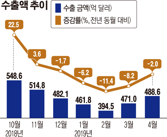 산업통상자원부가 1일 발표한 '2019년 4월 수출입 동향'에 따르면 지난달 한국의 수출액은 488억6000만 달러다. 지난해 같은 달(498억5000만 달러)과 비교하면 2.0% 줄어든 액수다. 한국의 월간 수출 성적(전년 동월 대비)이 악화한 것은 지난해 12월 이후 다섯 달째다.