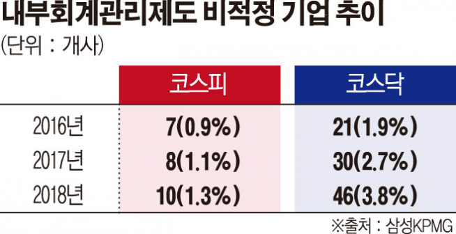 삼정KPMG에 따르면 국내 상장법인의 내부회계관리제도 비적정 검토의견은 매년 증가 추세다. 2018년 2.9%로 2016년 1.5% 대비 2배 증가한 것으로 나타났다.