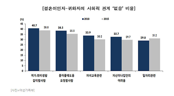 여성가족부가 2일 발표한 2018년 전국 다문화가족 실태조사 결과에 따르면 장기 거주로 다문화가족의 한국 생활 적응도는 높아진 반면, '도움‧의논 상대가 없다'라는 비율은 늘어나는 등 사회관계망 부족이 심화된 것으로 나타났다.