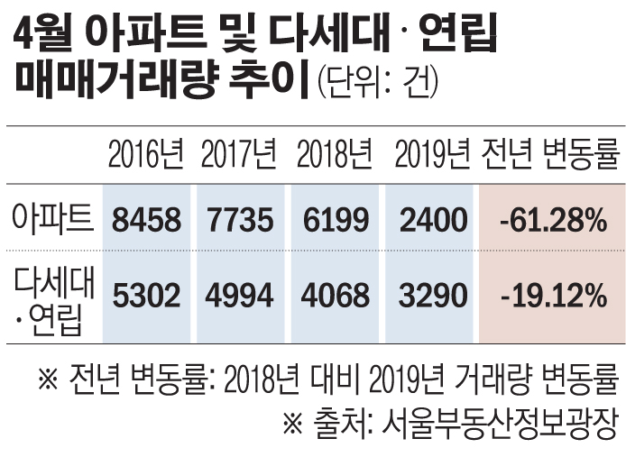 반면 다세대·연립은 거래량에서 비교적 선방했다. 4월 거래량이 3290건을 기록하며 지난해 동월(4068건)보다 19.13% 감소한 데 그친 것이다. 이는 2016년(5302건), 2017년(4994건) 등 과거와 비교해도 아파트에 비해 거래 감소폭이 적었다. 다세대·연립 거래량은 지난해 11월부터 6개월째 아파트 거래량을 앞서고 있다. 지난해 10월만 해도 서울 아파트 거래량은 1만92건으로 다세대·연립(5422건)의 2배 가까이 많았다.