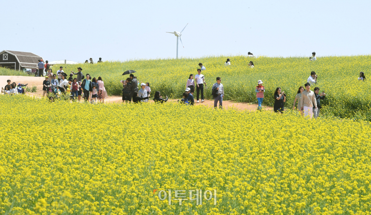 어린이날 연휴 마지막날인 6일 경기 안성시 공도읍 농협안성팜랜드를 찾은 시민들이 노란 유채꽃밭 사이를 거닐며 계절의 정취를 만끽하고 있다. 신태현 기자 holjjak@