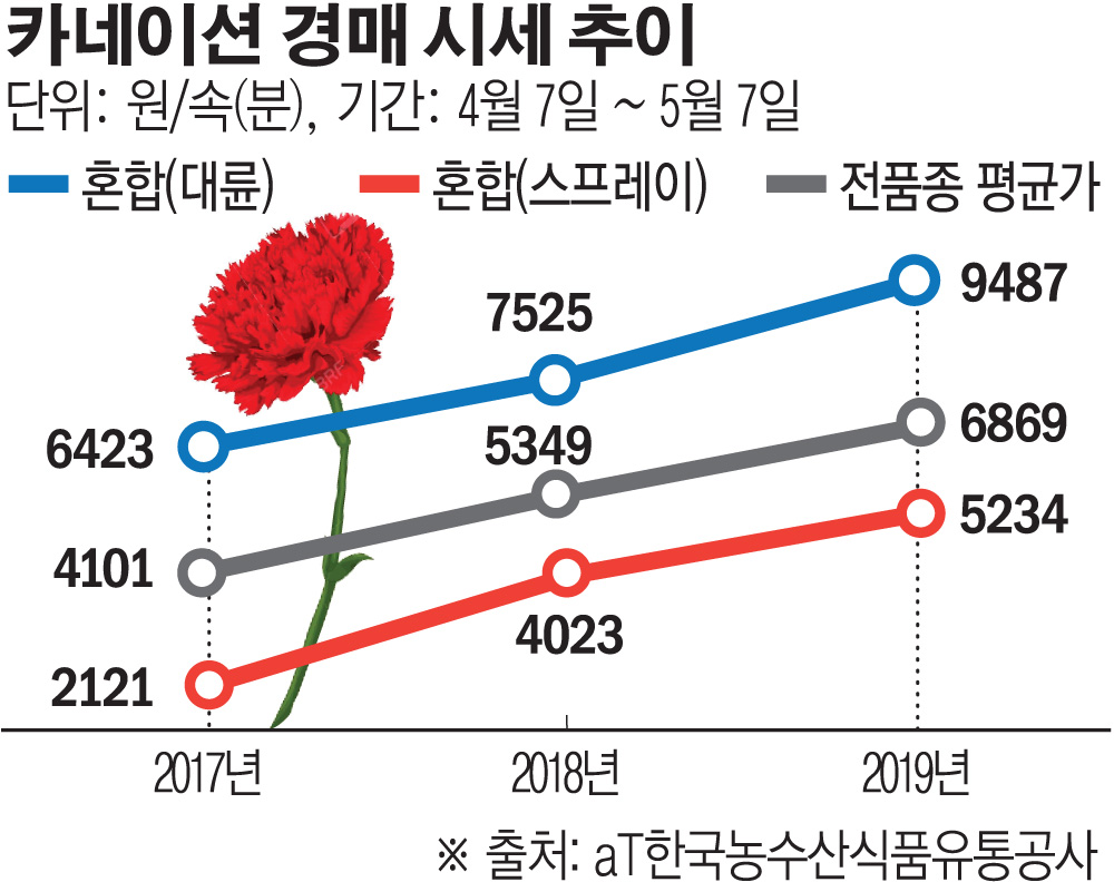 최근 한 달(2019년 4월 7일~ 5월 7일) 동안 카네이션 1속(20송이)의 평균 가격은 6869원이다. 지난해 같은 기간(2018년 4월 7일~5월 7일) 평균가격 5349원에 비해 28.42% 오른 수준이다.
