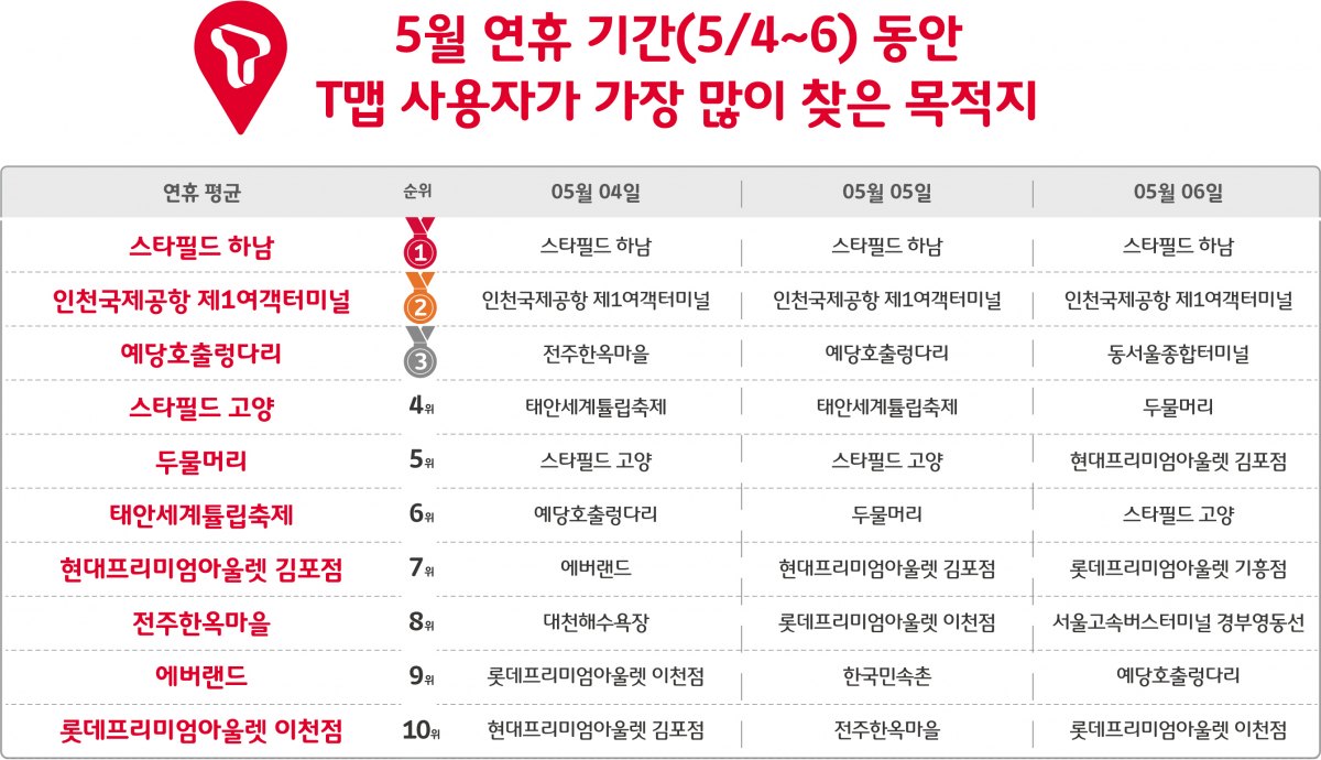 이번 연휴 기간 중 가장 인기를 끈 목적지는 프리미엄 아웃렛이었다. 스타필드 하남(5만 여명) 등 총 4개 프리미엄 아웃렛이 T맵 이용자가 많이 찾은 상위 10개 목적지에 포함됐다.