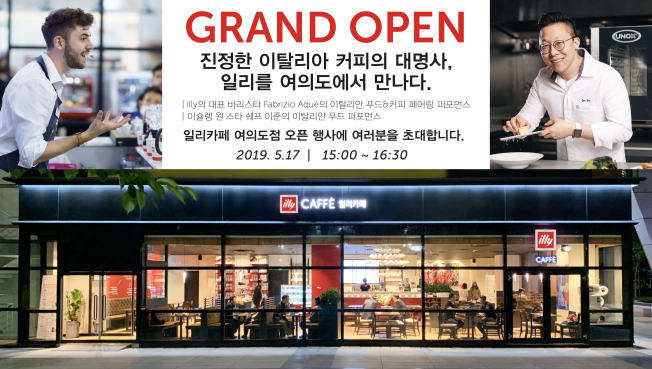 일리카페는 신규 푸드 메뉴를 홍보하기 위해 17일 여의도점 오픈 기념 커피, 푸드 메뉴의 시연 퍼포먼스를 개최한다. 전세계 일리카페(illy Caffé) 바리스타들의 트레이닝 책임자이자 메뉴 개발자인 파브리지오 아퀘(Fabrizio Aqué)가 일리커피와 이탈리안 푸드의 페어링 메뉴 제조를 선보인다. 또, 미슐랭 원 스타 레스토랑 ‘스와니에’의 셰프로 유명한 이준이 선보이는 정통 이탈리안 푸드 시연도 눈길을 끌 전망이다.