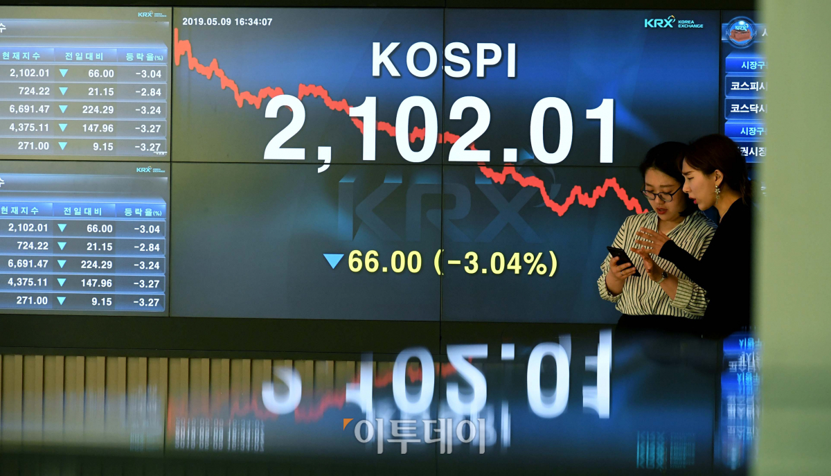 코스피가 미중 무역전쟁에 대한 불안감에 급락한 9일 오후 서울 여의도 한국거래소(KRX) 서울사무소 전광판에 코스피지수가 전 거래일보다 66.00포인트(3.04%) 내린 2102.01를 가리키고 있다. 신태현 기자 holjjak@