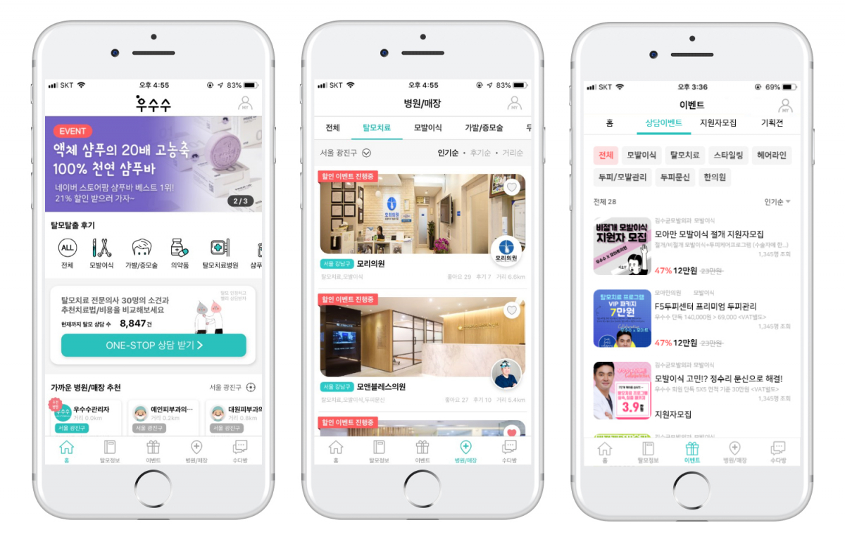 사용자들은 오프라인 방문 없이 앱을 통해 탈모 전문 병원의 위치, 방문 후기, 비용, 이벤트 등을 확인할 수 있으며 탈모 전문가 다수의 의견과 비용 비교를 통해 합리적인 정보를 획득할 수 있다.