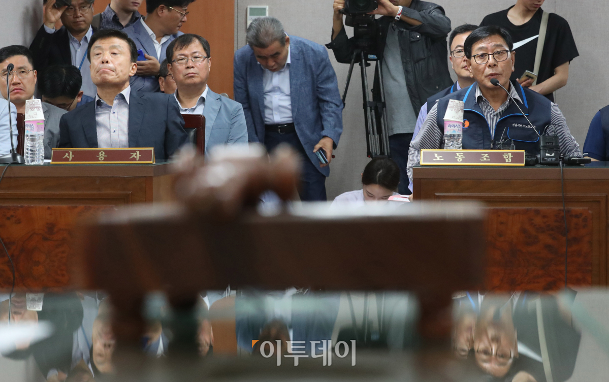 임금 5.98% 인상, 정년 연장, 학자금 등 복지기금 연장 및 증액을 두고 협상을 벌여온 서울지역 버스노사가 14일 서울 영등포구 문래로 서울지방노동위원회에서 열린 2차 조정 회의에 참석해, 서정수 서울시버스노동조합 위원장(오른쪽)이 인사말을 하고 있다. 왼쪽은 피정권 서울시 버스운송사업조합 이사장. 신태현 기자 holjjak@