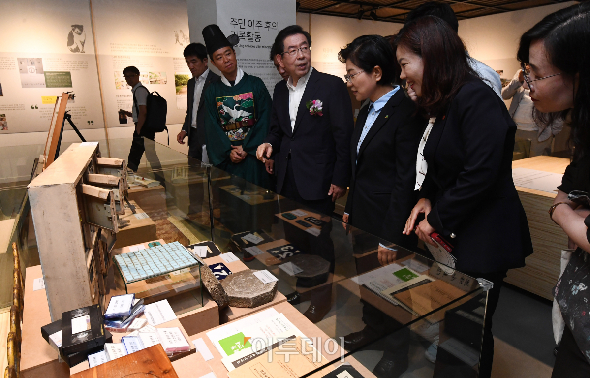 박원순 서울시장 등이 15일 서울 은평구 통일로 서울기록원에서 열린 개원식에서 기록전시실을 둘러보고 있다. 서울시 중요 기록물 130만여점을 영구적으로 관리 보존할 서울기록원은 약 2개월간의 시범운영을 마치고 이날 정식으로 문을 열었다. 신태현 기자 holjjak@