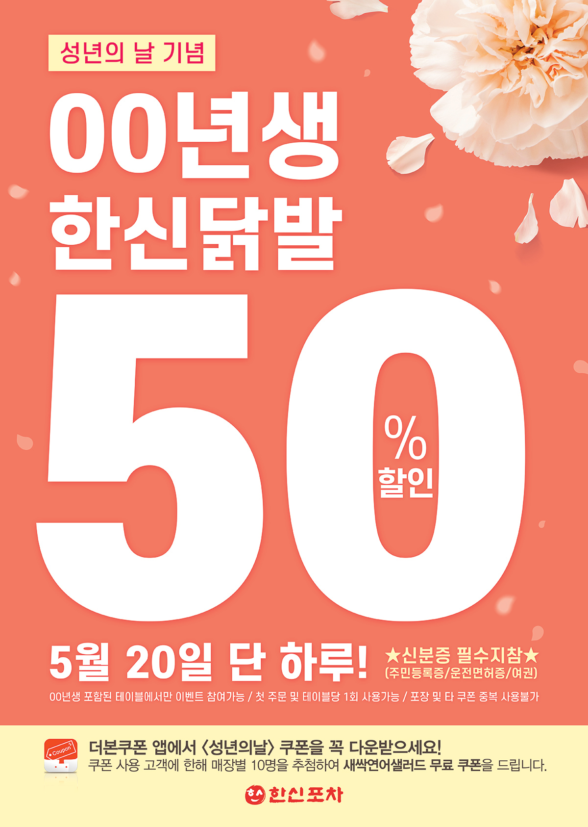 더본코리아의 실내포차브랜드 한신포차가 성년의 날을 기념해 20일 단 하루, 2000년도에 출생고객에게 ‘한신닭발 50% 할인’ 행사를 진행한다고 15일 밝혔다.