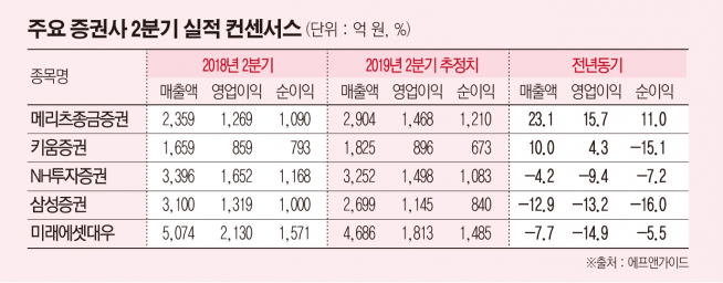 1분기 실적 잔치에도 증권업계의 2분기 실적 전망은 그리 밝지 않다. 최근 미·중 무역협상 리스크가 다시 부각되면서 글로벌 증시의 변동성은 물론 기업실적에 대한 우려도 커지고 있기 때문이다. 금융정보업체 에프앤가이드에 따르면 미래에셋대우, NH투자증권, 삼성증권, 키움증권 등 주요 증권사 5곳의 올해 2분기 연결 순이익 컨센서스는 전년동기 대비 5.9% 감소한 5291억 원이 될 것으로 집계됐다.