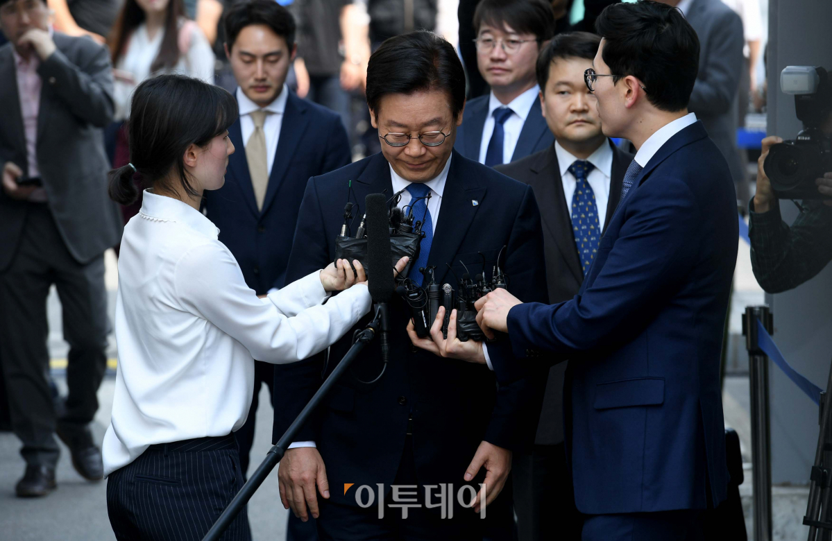 직권남용과 공직선거법 위반 혐의 등으로 기소된 이재명 경기지사가 16일 경기 성남시 수정구 수원지방법원 성남지원에서 열린 1심 선고 공판에 출석하고 있다. 신태현 기자 holjjak@