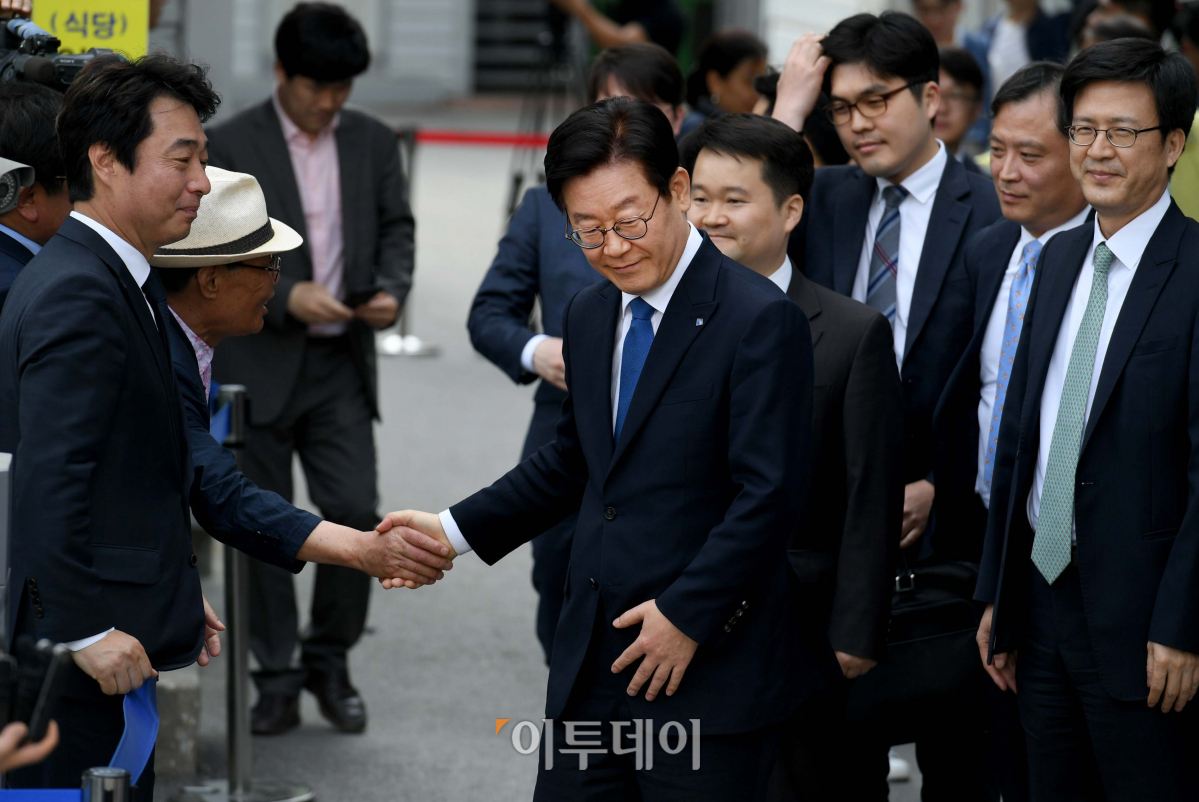[포토]무죄 선고 뒤 지지자와 악수하는 이재명 지사
