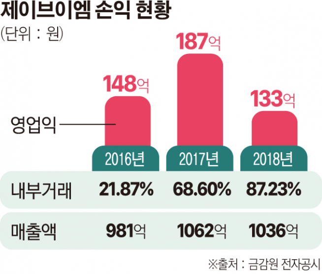 금융감독원 전자공시시스템에 따르면 제이브이엠이 지난해 계열사들로부터 상품 및 제품 판매 등으로 거둬들인 매출은 총 904억 원으로, 전체 매출에서 차지하는 비중은 87.23%에 달한다. 올 1분기 기준으로는 89.97%로 지속적으로 오르고 있다.