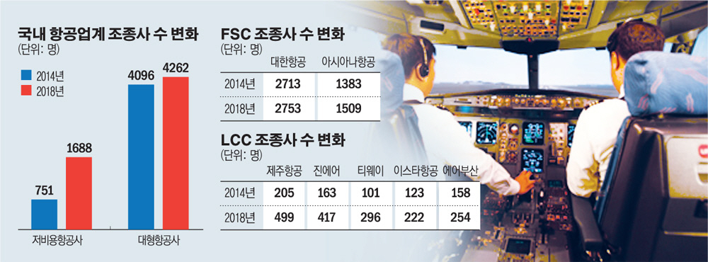 19일 국토교통부가 분석한 항공 종사자 현황에 따르면, 2014년부터 최근 5년간 LCC의 조종사 수(사업용 포함)는 751명에서 2018년 1688명으로 124.8% 급증했다.