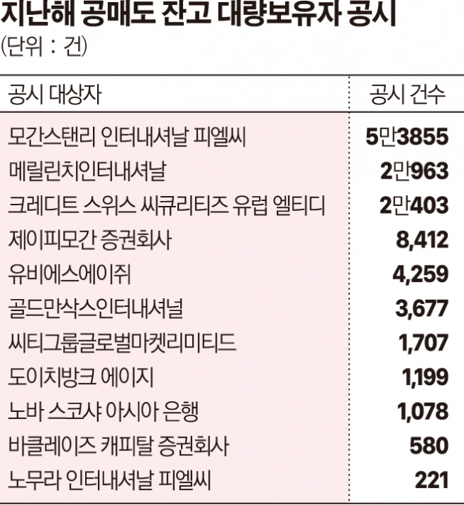 가장 많이 공시한 곳은 영국계 금융사인 모간스탠리 인터내셔날 피엘씨로 전체의 44.5%(5만3855건)를 차지했다. 이어 △메릴린치인터내셔날(17.3%, 2만963건) △크레디트 스위스 시큐리티즈 유럽 엘티디 (16.9%, 2만403건) △제이피모간 증권회사 (7.0%, 8412건) △유비에스에이쥐(3.5%, 4259건) △골드만삭스인터내셔널 (3.0%, 3677건) 등의 순이다.