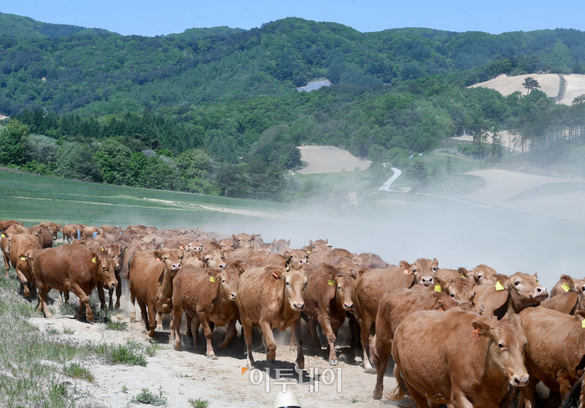 신록이 짙어가는 22일 강원 평창군 대관령면 국립축산과학원 한우연구소에서 올해 처음 방목된 한우 300여 마리가 초지를 힘차게 달리고 있다. 신태현 기자 holjjak@