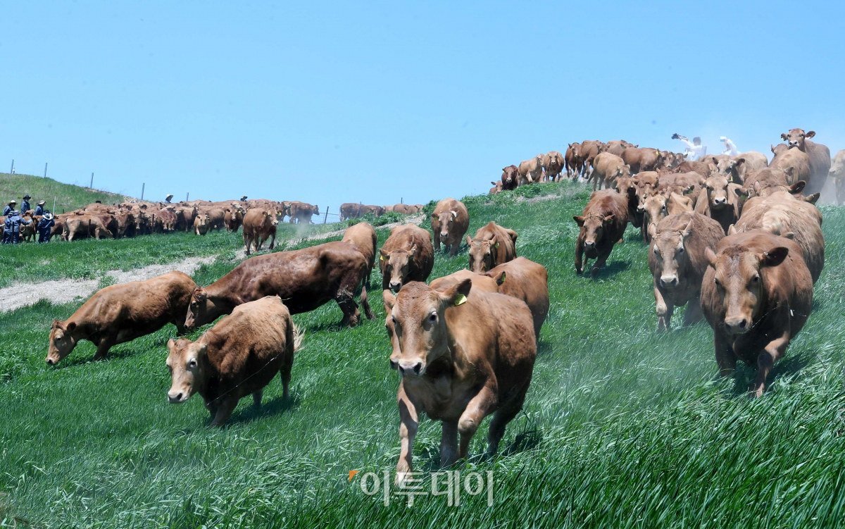 신록이 짙어가는 22일 강원 평창군 대관령면 국립축산과학원 한우연구소에서 올해 처음 방목된 한우 300여 마리가 초지를 힘차게 달리고 있다. 신태현 기자 holjjak@