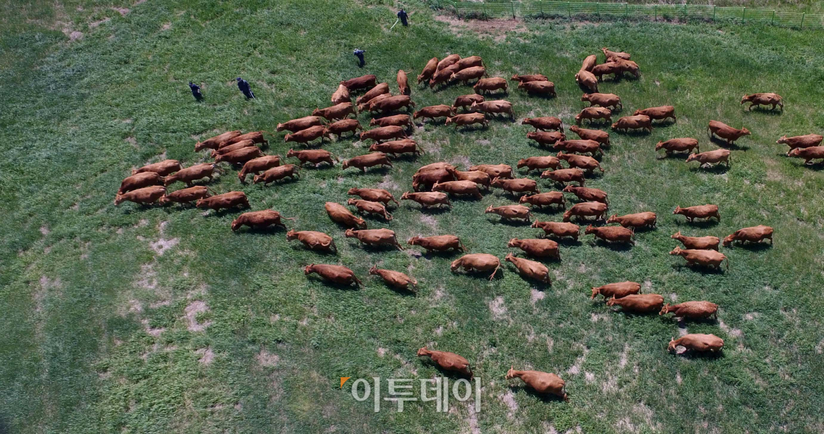 신록이 짙어가는 22일 강원 평창군 대관령면 국립축산과학원 한우연구소에서 올해 처음 방목된 한우 300여 마리가 초지를 힘차게 달리고 있다. 신태현 기자 holjjak@