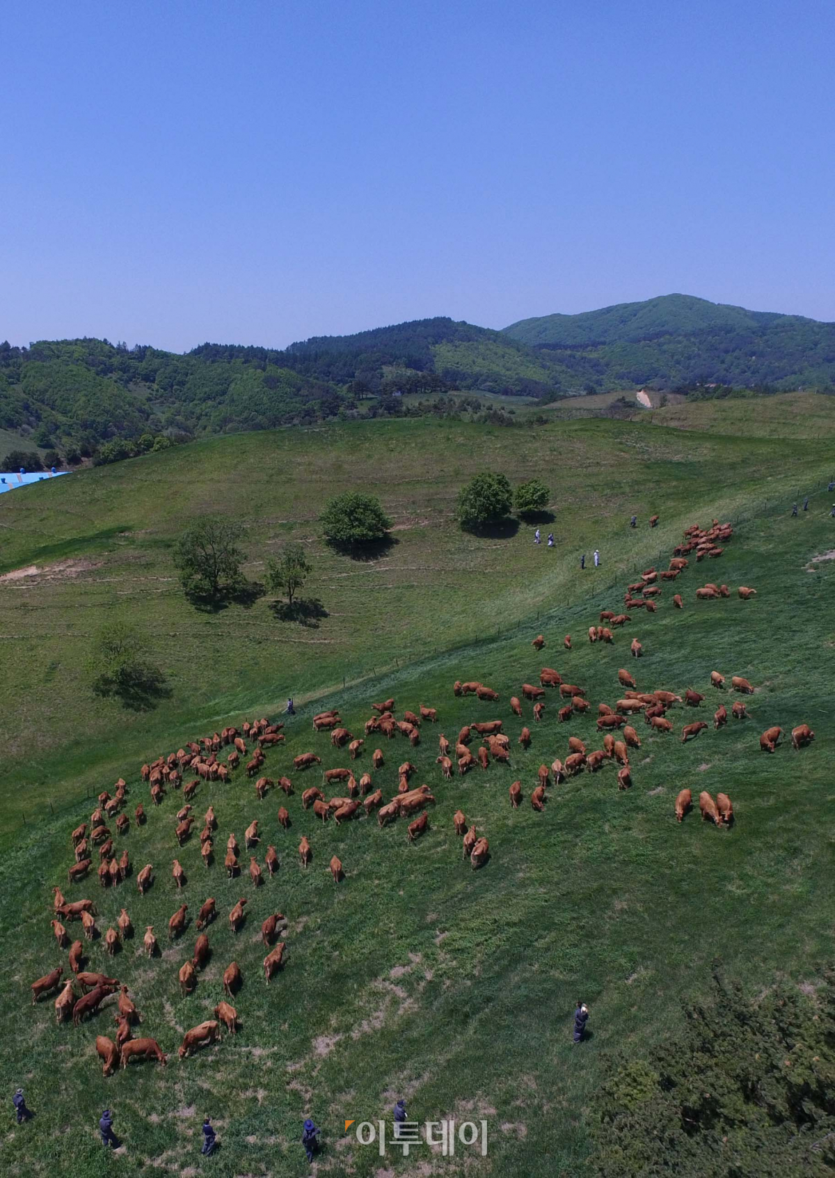 신록이 짙어가는 22일 강원 평창군 대관령면 국립축산과학원 한우연구소에서 올해 처음 방목된 한우 300여 마리가 초지에서 풀을 뜯고 있다. 신태현 기자 holjjak@
