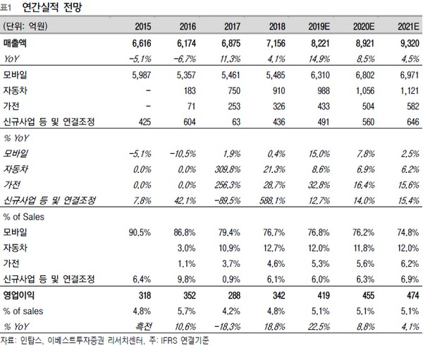 정 연구원은 “1분기 신규 사업의 영업이익은 자동차 20억 원(영업이익률 8.3%), 가전 7억 원(6.5%)으로 합산 영업이익 기여도는 24.6% 수준”이라며 “참고로 신규 사업 부문의 영업이익 기여도는 2017년 -19.3% → 2018년 15.0% →2019년 1분기 24.6% 비중으로 확대되고 있다”고 설명했다.