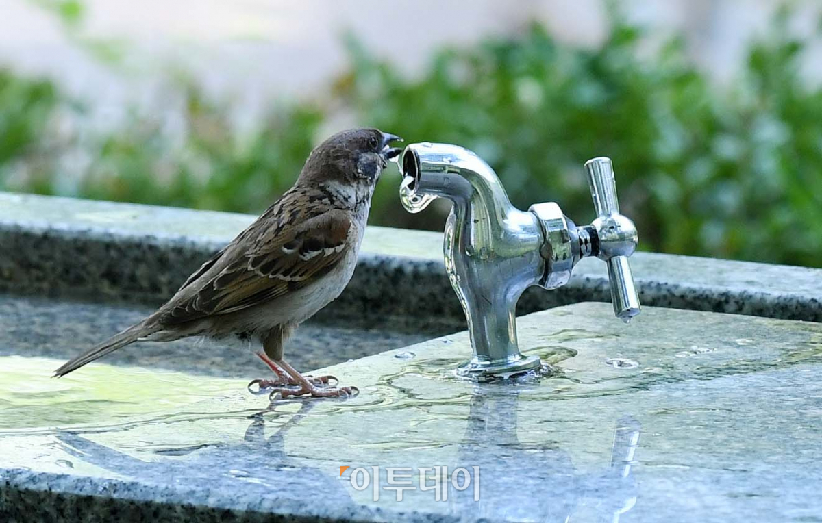 대구 낮 최고기온이 35도 서울이 32도를 기록할 것으로 예보되고 전국 곳곳에 폭염주의보가 내려진 24일 서울 용산구 효창공원에서 참새 한 마리가 물을 마시며 더위를 식히고 있다. 신태현 기자 holjjak@