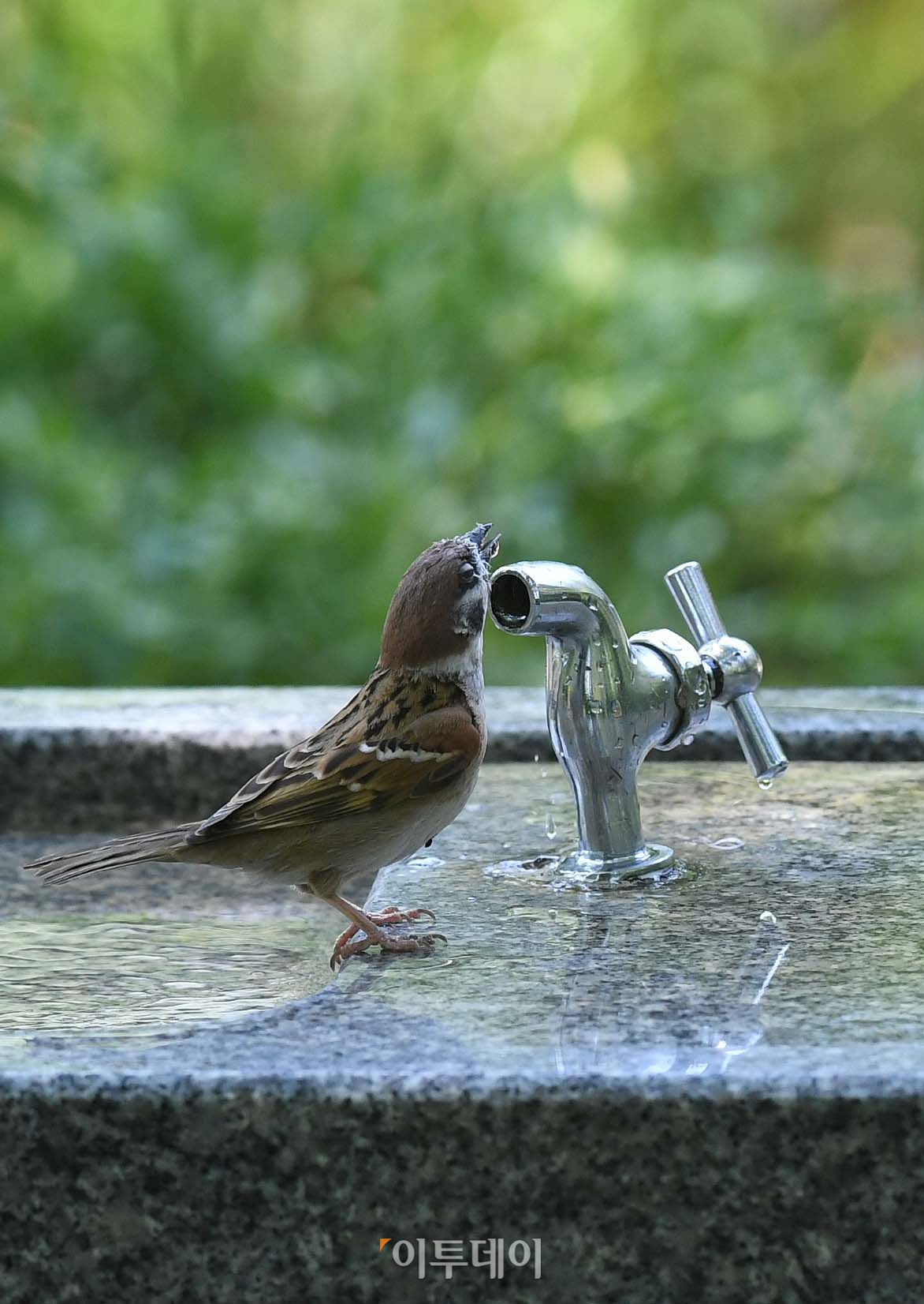 대구 낮 최고기온이 35도 서울이 32도를 기록할 것으로 예보되고 전국 곳곳에 폭염주의보가 내려진 24일 서울 용산구 효창공원에서 참새 한 마리가 물을 마시며 더위를 식히고 있다. 신태현 기자 holjjak@