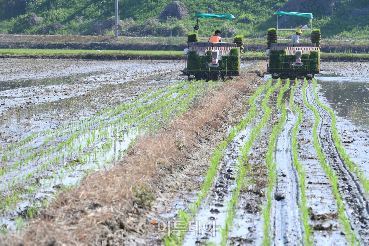 본격적인 농사철에 접어든 23일 경기 파주시 문산읍의 한 논에서 모내기가 한창이다. 신태현 기자 holjjak@
