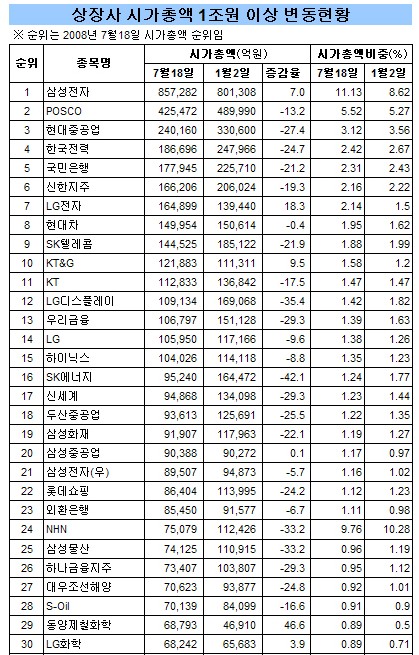 또 서울반도체, NHN 등 코스닥시장을 주도하고 있는 우량 벤처기업과 유가급등으로 인해 실적감소 우려가 높아진 SK에너지, GS 등 정유사들의 시가총액 하락율도 일반 제조업 관련 기업들에 비해 높게 나타났다.