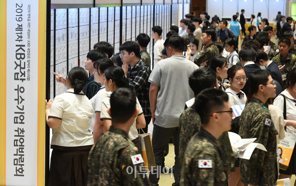28일 서울 강남구 영동대로 코엑스에서 열린 ‘2019 제1차 KB굿잡 우수기업 취업박람회’에서 구직자들이 채용공고게시판을 살펴보고 있다. 250여개 중소·중견기업이 참여하는 이번 박람회는 29일까지 열린다. 신태현 기자 holjjak@